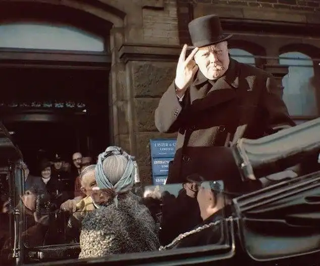 Уинстон Черчилль с сигарой во рту показывает знак "V" во время визита в Брэдфорд. 4 декабря 1942 года.