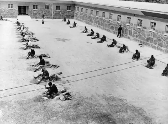 Заключенные дробят булыжники и шьют тюремную одежду. Роббенэйланд. ЮАР. 1964 год.
