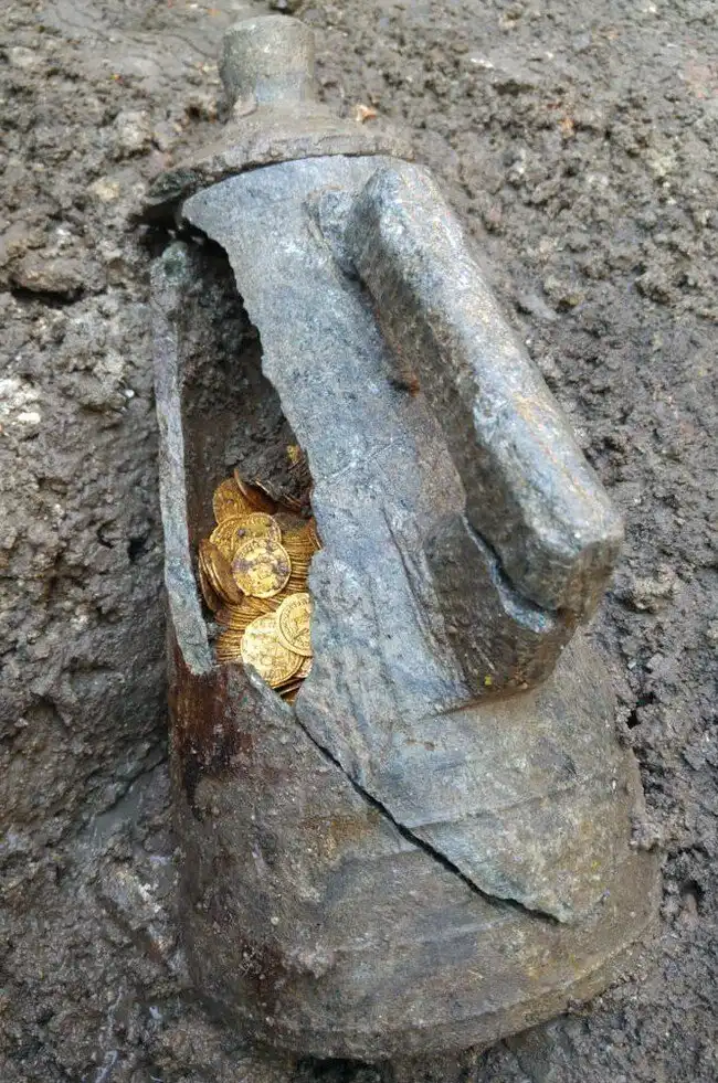 Амфора, наполненная золотыми монетами. Обнаружена в городе Комо, Италия.
