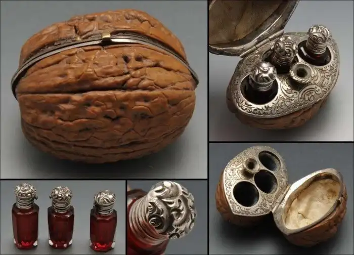 Ореховый чехол с петлями и тремя флаконами для духов, Франция XIX век