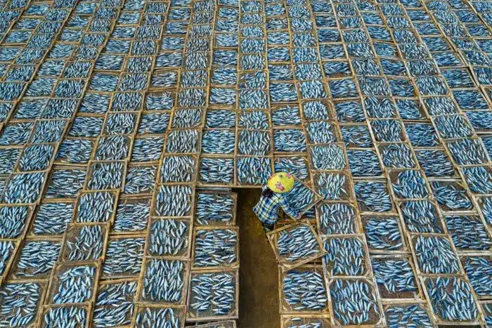 Женщина в окружении сотен лотков с сушеной рыбой на рыбном рынке Лонг Хай в Ба Риа-Вунгтау, Вьетнам. Вид сверху напоминает большое тканевое полотно с необычным узором, которое женщина будет сплетает из отдельных кусочков.