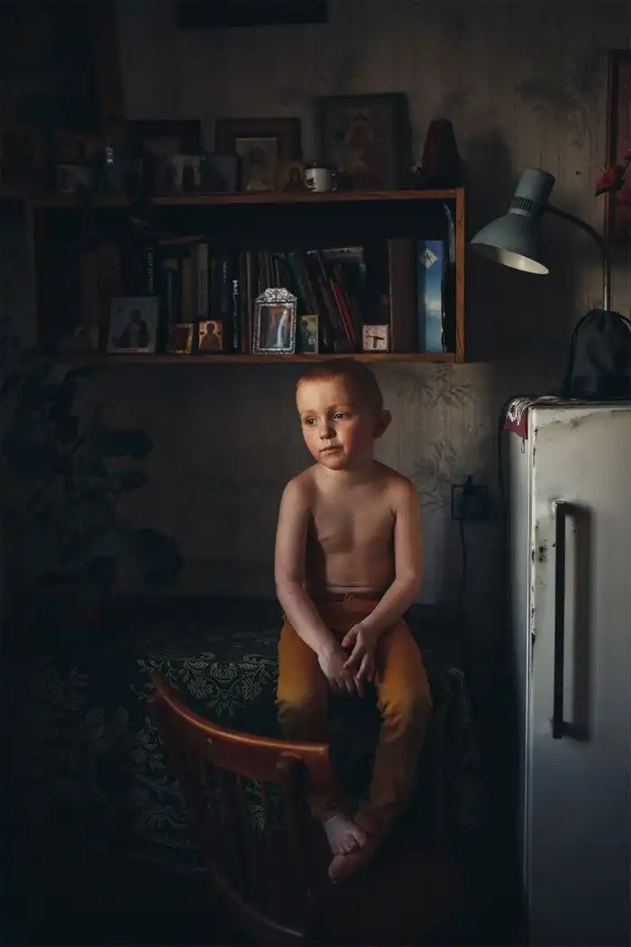 Мальчик, сидящий на столе и погруженный в серьезные размышления. Фотография показывает другую сторону детства - спокойную и задумчивую.