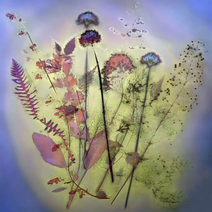 Садовые растения, экспонированные на солнце на черно-белую фотобумагу. Фотограф объединил полученные фотографии в цифровом виде, чтобы создать эфирное цветочное изображение с эффектом дикого сада.