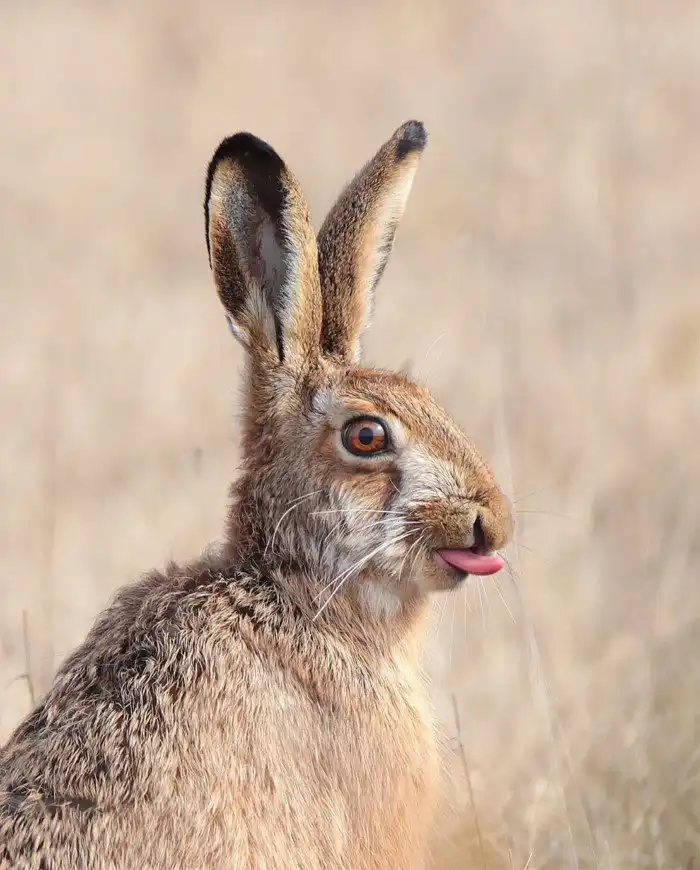 Забавная фотография зайца с высунутым языком.