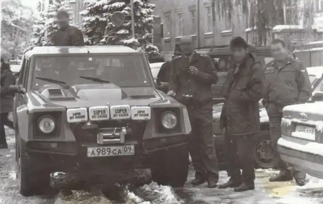 Милиционеры смотрят и фотографируют редкое авто Lamborghini LM002. 90-е