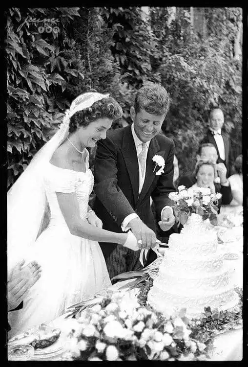 Жаклин Кеннеди и Джон Кеннеди разрезают торт на собственной свадьбе. Ньюпорт, Род-Айленд. 12 сентября 1953 года.