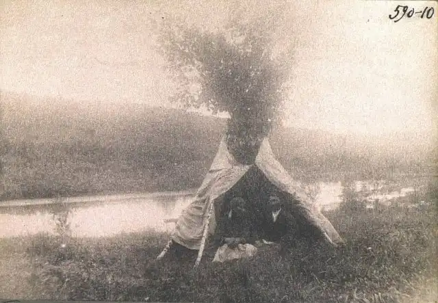Шалаш, в котором скрываются сбежавшие жених и невеста, Томская губерния, Российская империя, Начало XX века.