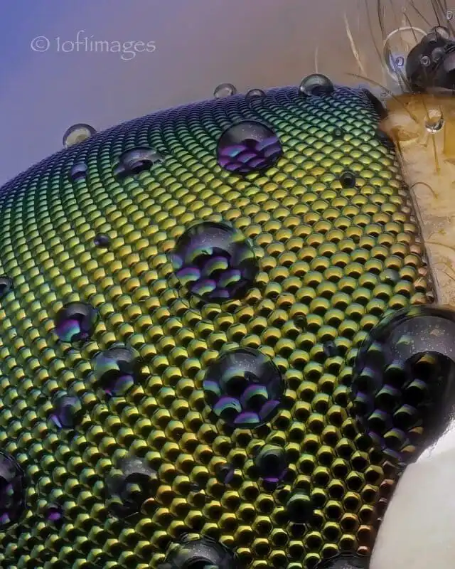 Глаз крошечной мухи с каплями росы