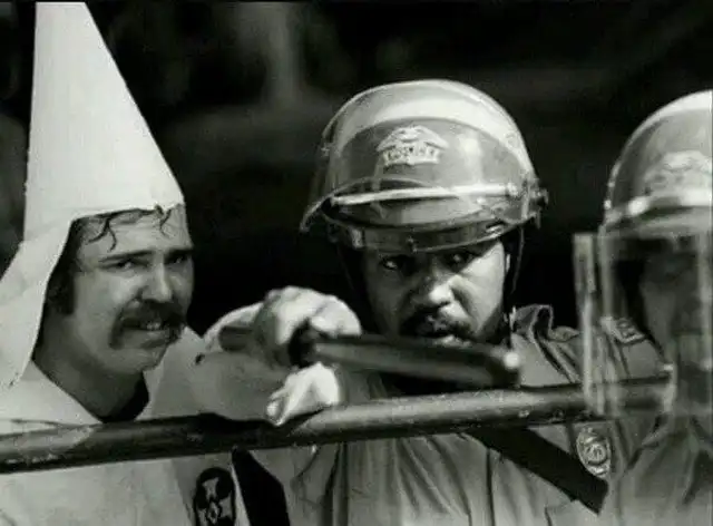 Чёрный полицейский защищает членов Ку-Клукс-Клана от протестующих, 1983 год.