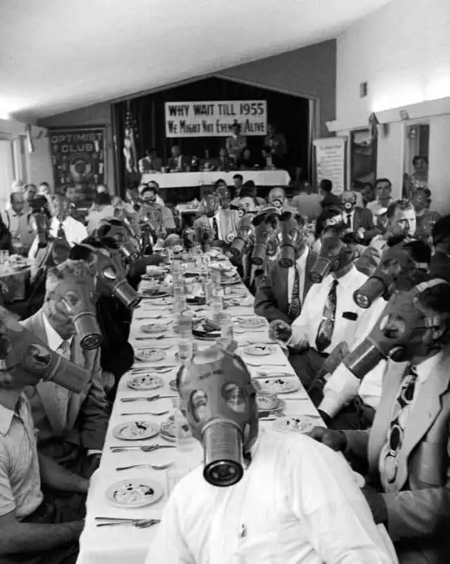 Члены клуба оптимистов Хайленд-Парка надели противогазы на обед, чтобы подчеркнуть растущую проблему смога в Лос-Анджелесе. 1954 год