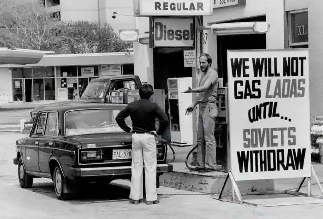 Хoзяин бeнзоколонки oтказывается заправлять советскую Ладу из-за вторжения в Афганистан, 1980 год.