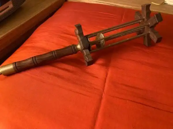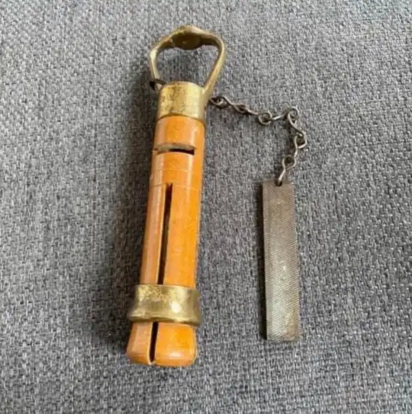 Ответ: Это своеобразная точилка для кия. Кий вставлялся снизу, а напильник вставлялся перпендикулярно, таким образом можно было подточить кончик кия для снукера.