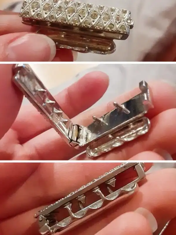 Ответ: Это зажим для одежды. Обычно они застегиваются на воротнике платья, блузки или пальто, при этом не могут продырявить ткань, как брошь.