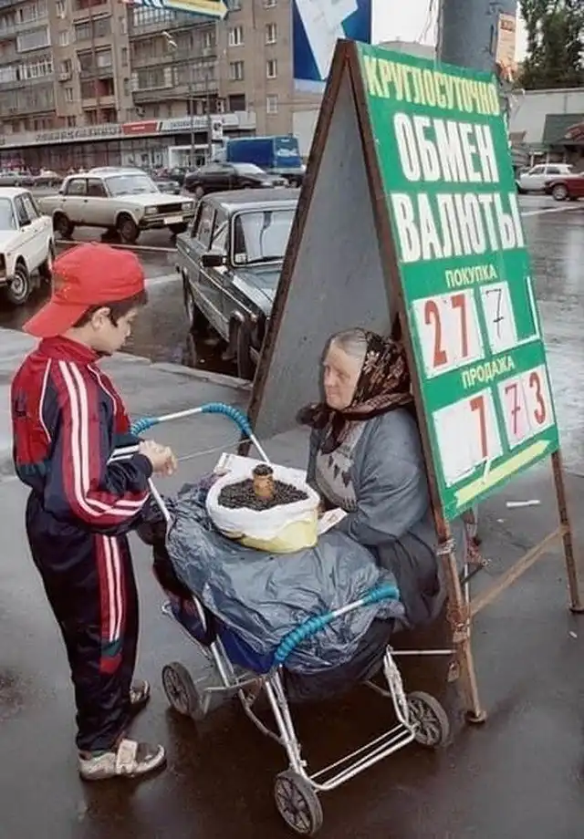 "Маленький стакан три рубля, большой пять" . Бабушка торгует семечками на улице, 1998 год.