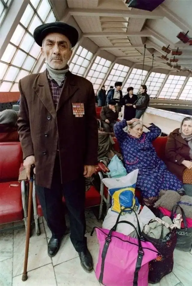 Пожилые армянские беженцы ждут помощи в аэропорту Еревана после эвакуации советской армией из Баку, 18 января 1990 г.