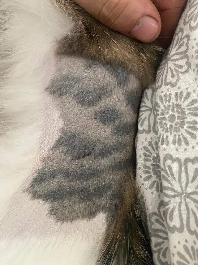Когда кошке сбрили шерсть на боку для операции, выяснилось, что у неё на коже тоже есть пятна
