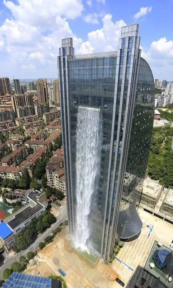 Искусственный водопад, созданный на небоскрёбе, Китай