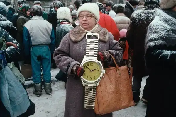 Женщина торгует на улице настенными часами в виде наручных, Россия, начало 1990-х.