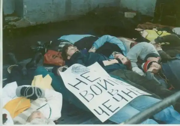Лежачий протест против войны в Чечне у здания Минобороны. Москва, 23 февраля 1995 год.