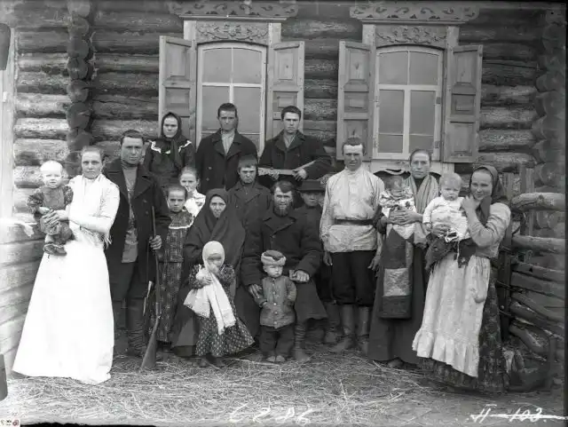 Групповое фото житeлей одного из сёл Енисейской губернии. Кто-то пришёл фотографироваться с ружьём, кто-то с балалайкой. Российская империя. 1910 год