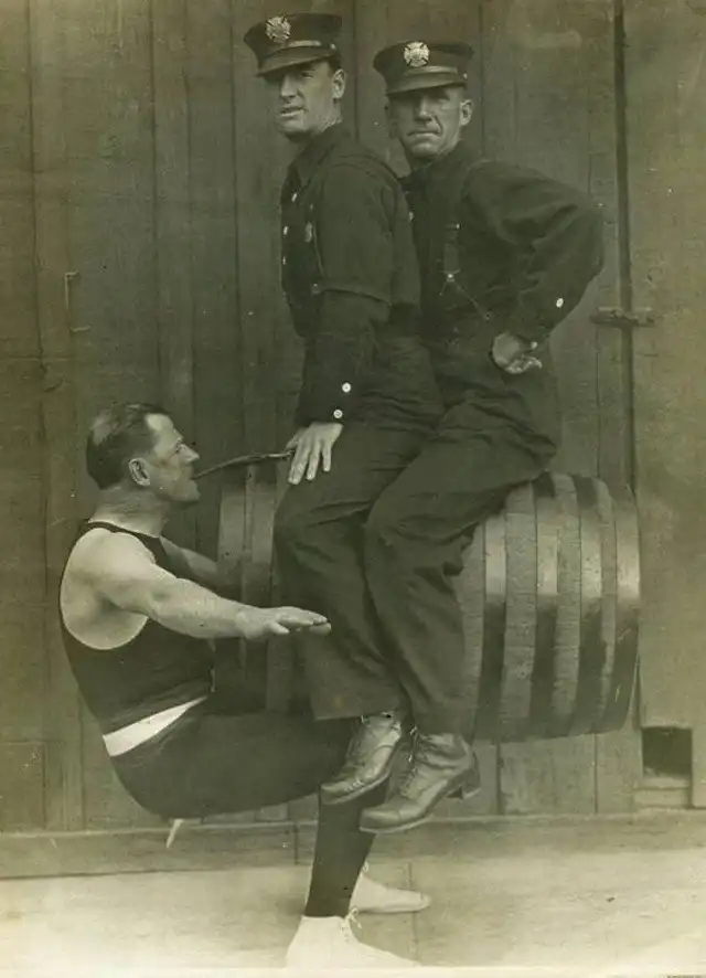 Гарри Ф. Гриффин, силач из пожарной охраны Лос-Анджелеса, держит зубами двух коллег, 1914 год.