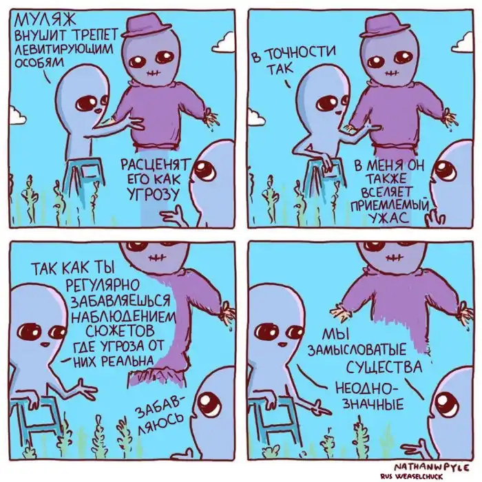 Конечно, это лишь домыслы, и мы не знаем, как они выглядят на самом деле, но американский художник Нэйтан Пайл представляет их себе как голубых человечков, которые пытаются жить также, как люди.