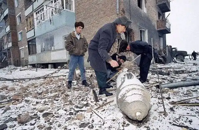 Чеченцы осматривают неразорвавшуюся бомбу после налета российской авиации на Аргун, 24 декабря 1994 года.