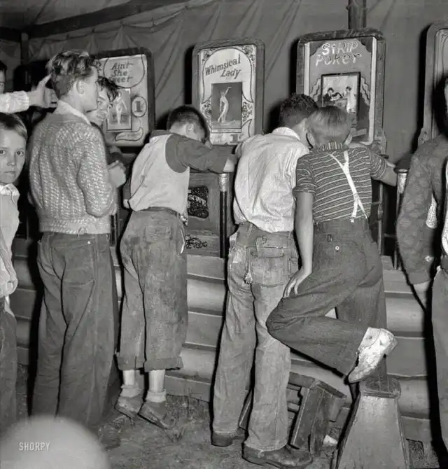 Парни за просмотром эротических фотокарточек в автоматах, 1938 год.