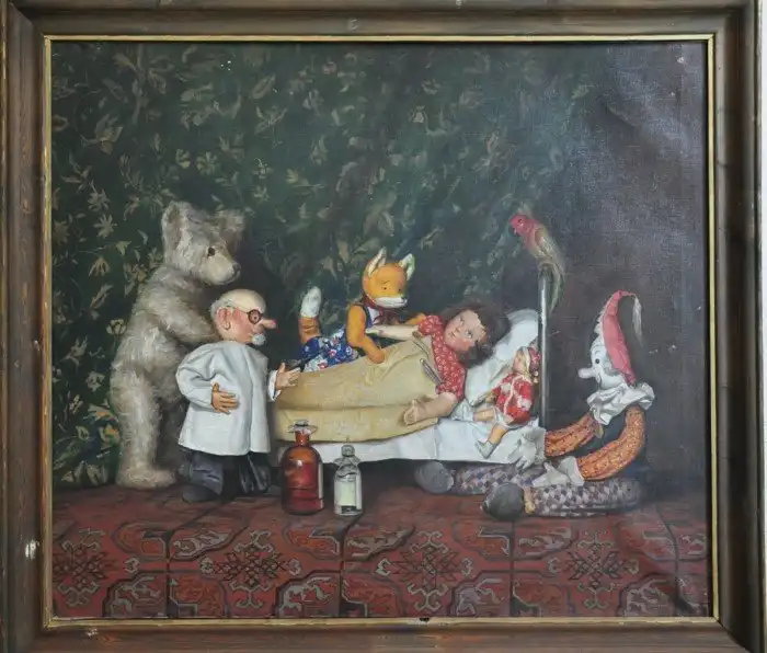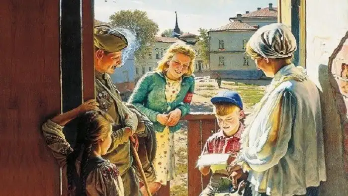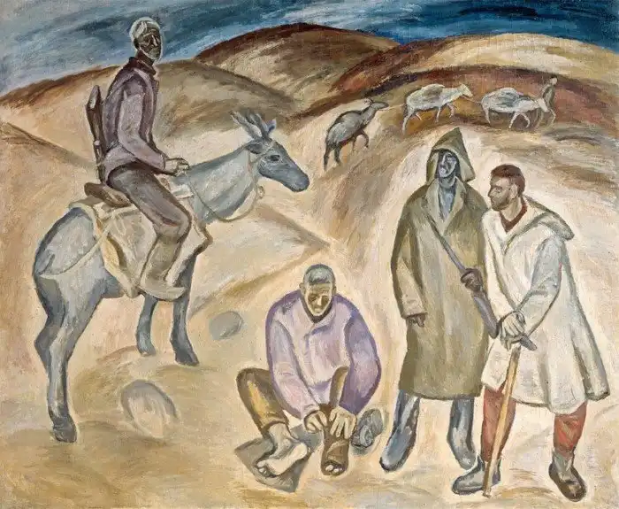 Парадоксальная фигура и художник уже следующего поколения. Он один из тех, кто серьезно всматривался в искусство старых мастеров, но при этом создавали свои новаторские интерпретации общепринятых сюжетов близкие к сюрреализму. Включая даже его растиражированную работу «Письмо с фронта».