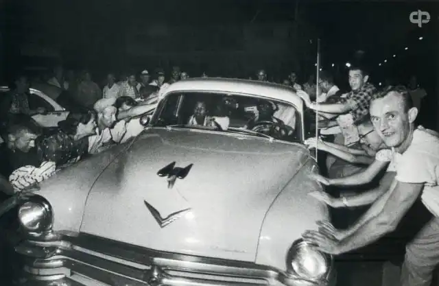 Толпа пытается перевернуть автомобиль с темнокожей семьей во время расовых беспорядков в г.Клинтоне. Теннесси. США. 1956 г.