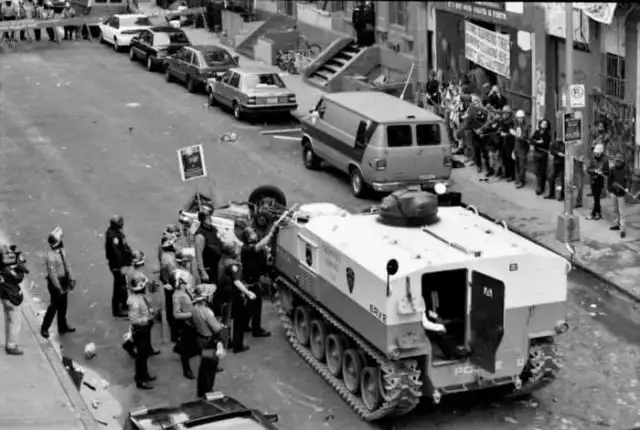 Спецназ NYPD пытается вычистить сквоттеров из зданий в Нижнем Ист–Сайде, 1995 год, Нью–Йорк.