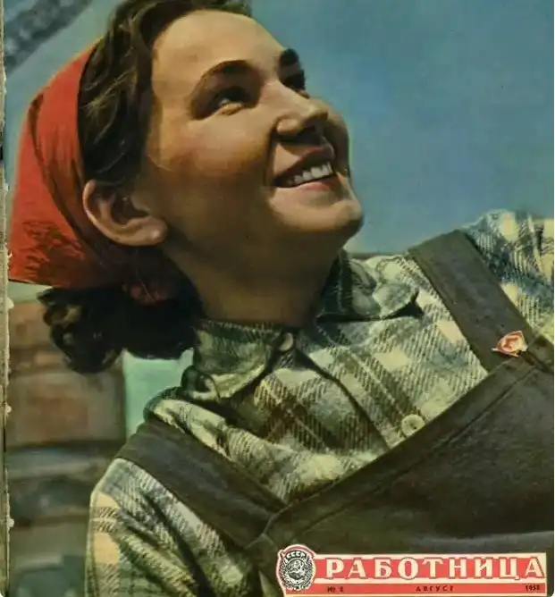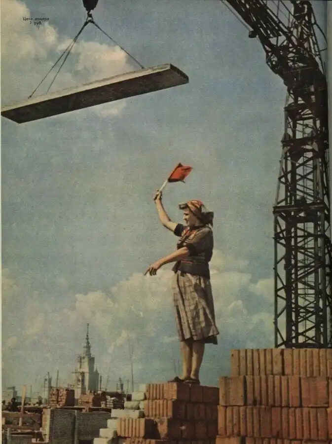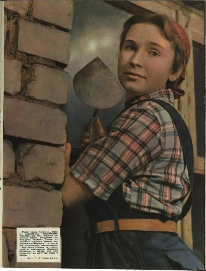 Строителями, наряду с мужчинами, были и женщины. Особенно в послевоенное время нужны были руки для восстановления городов. Такую красавицу и комсомолку - только на обложку журнала!