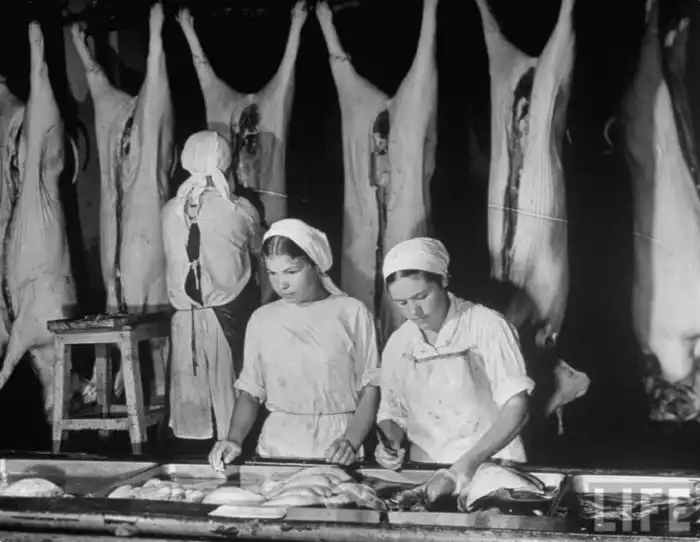 Мясниками были не только мужики, но и такие хрупкие, казалось бы, женщины. Вот уж точно в те времена в колбасе было мясо!!!