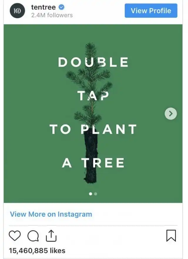 Канадский бренд Tentree придумал акцию: за пять миллионов лайков под фото пообещал высадить полмиллиона деревьев, а за 20 миллионов — 1 миллион деревьев. Всего удалось собрать 15,5 миллиона лайков. И свое обещание они выполнили.