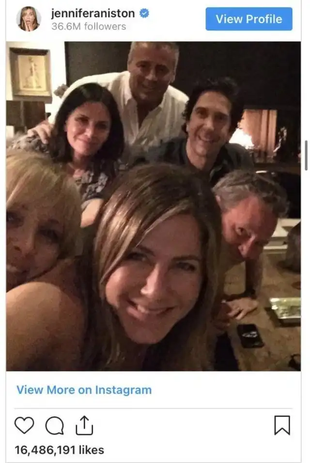 Приход Дженнифер Энистон в Instagram получился громким. Она опубликовала снимок с героями сериал "Друзья" - и за 5 часов получила 1 миллион подписчиков, а за день - 11 миллионов. Само фото лайкнули 16,4 миллиона раз.