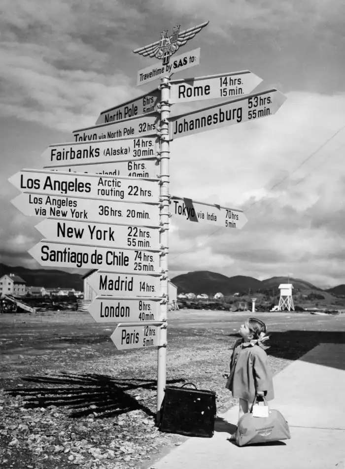 Указатель полетного времени до мировых столиц в аэропорте Бодо в Норвегии, 1968 год