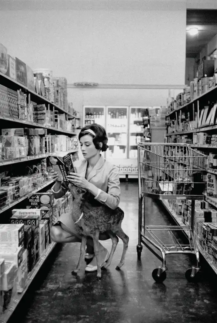 Одри Хэпберн в магазине Беверли Хиллз вместе со своим домашним оленем, 1956 год