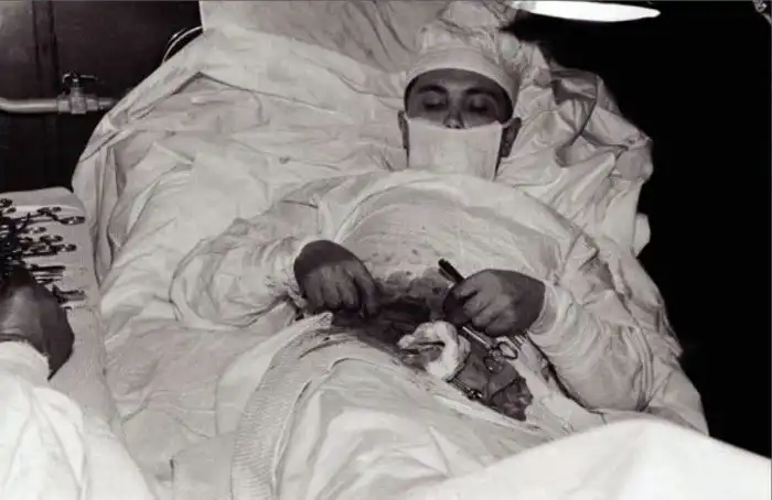 Врач советской антарктической экспедиции Леонид Рогозов проводит себе аппендэктомию, 1961 год