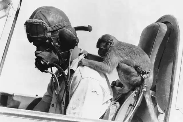 Талисман эскадрильи Королевских ВВС Великобритании в Ливии: обезьяна по кличке Бас играет с пилотом истребителя «Tomahawk» в Западной пустыне, 15 февраля 1942 года.