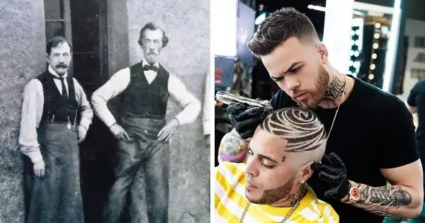 Работники парикмахерской конца 19 века и современный барбер.