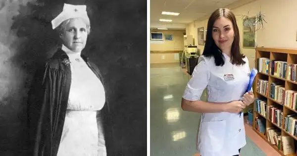 Знаменитая американская медсестра Джейн Делано, одна из основательниц профессии, и современная медсестра.