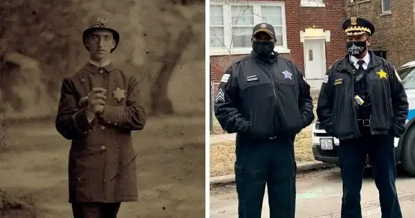 Чикагский полицейский конца 19 века и нынешние офицеры чикагского полицейского департамента.