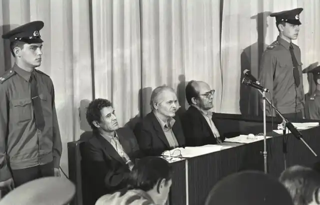 Директор Чернобыльской АЭС Виктор Брюханов (слева), Анатолий Дятлов (в центре) и главный инженер Николай Фомин во время судебного заседания по делу о ядерной катастрофе 1986 года.