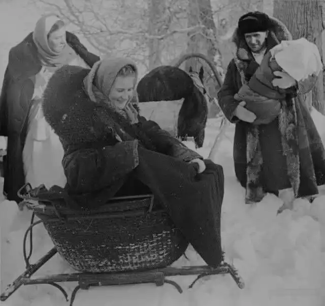 Муж забирает жену с ребёнком из роддома, 1950-е .