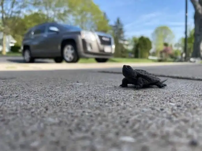 8. Детеныш каймановой черепахи, отважно пересекающий проезжую часть