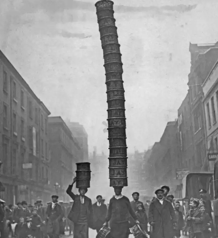 Носильщик Джим Сейнсберри переносит на голове 20 корзин одновременно, 1928 г.