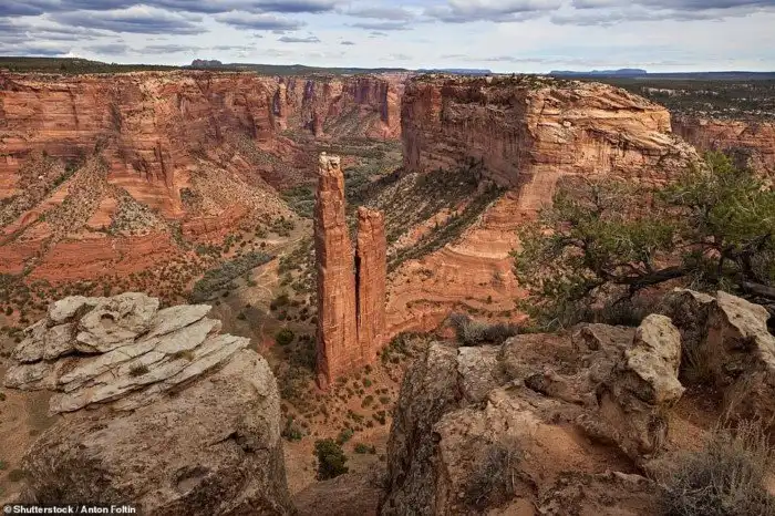 Каньон Де Шейи находится на северо-востоке Аризоны на территориях племени навахо. Здесь даже сохранились руины построек древних индейцев анасази, а навахо жили на этой местности в течение почти 5000 лет. Гиды навахо проводят пешие и конные прогулки по каньону, а также прогулки на джипах. Впечатляющая достопримечательность каньона - Скала Паука высотой 244 м (на фото).