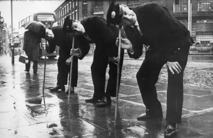 18. Три инспектора по подземным водам проверяют с помощью ясеневых тростей возможные места утечек в трубах под Розвери-роуд. 1966 год, Лондон, Англия