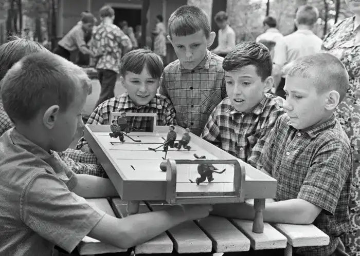 33. Дети играют в настольный хоккей на специальной площадке для настольных игр в парке Горького, 1963 год