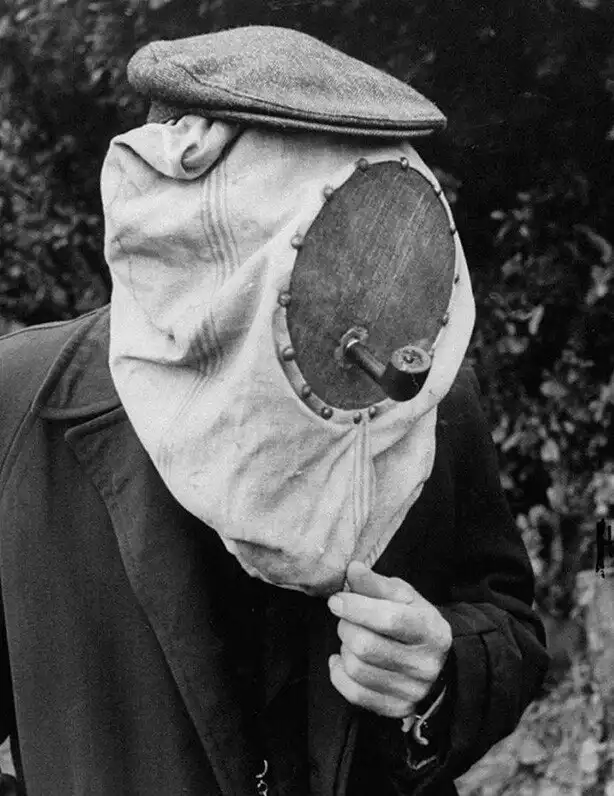 34. Голландский пчеловод в специальной защитной маске с отверстием для трубки,чей дым помогает отпугивать насекомых, 1956 год.